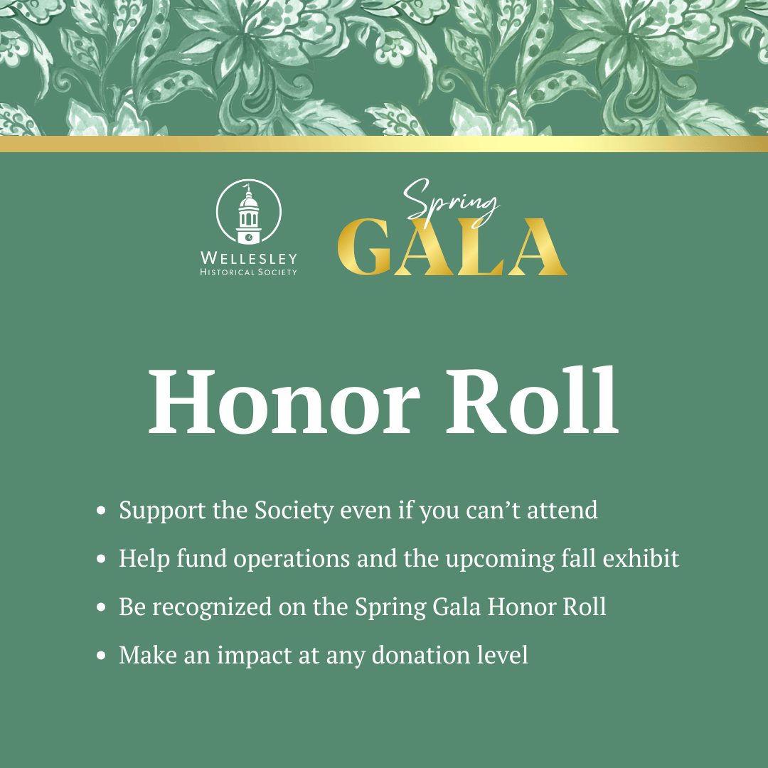 Join us for an elegant evening at the Wellesley Historical Society’s Spring Gala, featuring dinner, an open bar, and a silent auction in support of our mission to preserve and share Wellesley’s history.